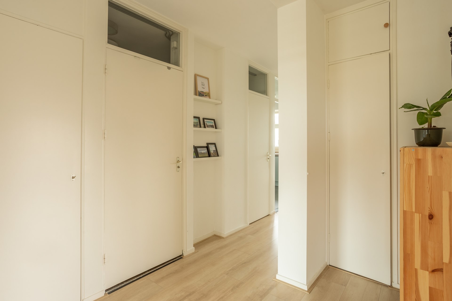 Je komt binnen via het afgesloten entreeportaal met brievenbussen, bellentableau en intercom. Met de lift of de trap bereik je de 5e etage, waar je het appartement betreedt en meteen het gevoel van licht en ruimte ervaart. De hal is voorzien van een praktische vaste kast en een garderobekast en geeft toegang tot alle vertrekken.